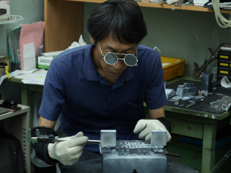 部品図を参考に、新井工場にてレーザー、マシニングセンター、スライシングの機械を使い、部品の作製を行います。